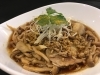 「かしまし豚の本来のおいしさを楽しんでいただくために、バラ肉をオリーブオイルで炒めてから蕎麦汁で煮立て、3種類のきのこと合わせました。最後にのせた挽肉は、口に含んだ時にお蕎麦と一緒にほぐれるようにしてあります。肉を使ったお蕎麦なのにクセがなく、あっさり上品に仕上げましたので女性の方にオススメです。」